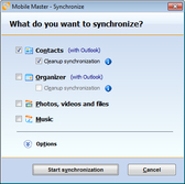Use Mobile Master to synchronize your contacts/address book, organizer, and multimedia data between your cell/smart phone and PC.